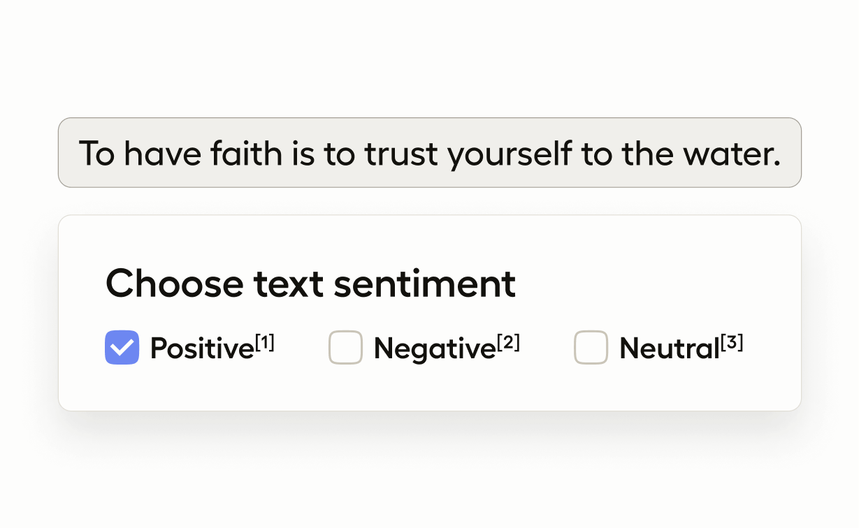 Use the Choices control tag to display classification options. The name parameter identifies the purpose of the choices, and the toName parameter references the text sample to which the choices apply.